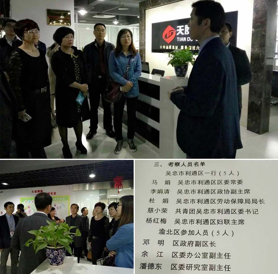2016年4月23日上午,宁夏吴忠市利通区区委常委马娟、政协副主席李娟清一行十余人在渝北区副区长邓明陪同下莅临重庆k8凯发网络信息技术有限公司进行考察调研,各位领导对k8凯发的发展情况及项目成果转化能力进行了考察和调研。