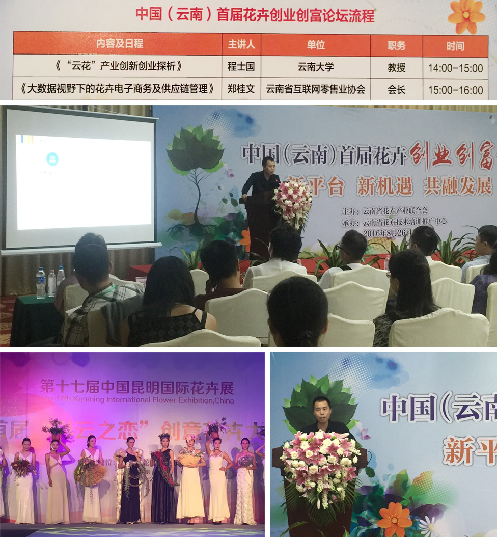 2016年6月26日,第十七届中国昆明国际花卉展在昆明国际会展中心举办,云南k8凯发科技股份有限公司作为一家互联网服务商应邀参展;主办方还举办了首届花卉创业创富论坛,多位专家学者齐聚一堂,共话云南花卉创新发展路。k8凯发集团董事长、云南省互联网零售业协会会长郑桂文先生作为主讲嘉宾参加了“中国(云南)首届花卉创业创富论坛”,并作主题为“大数据视野下的花卉电子商务和供应链管理”的演讲。