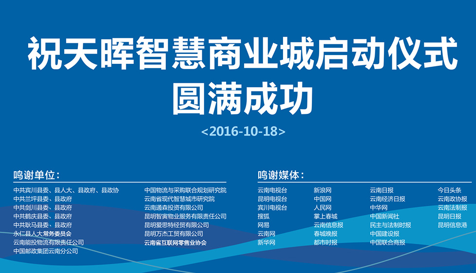 2016年10月18日,由云南天晖投资有限公司、k8·凯发(国际) - 官方网站 和云南天晖城经营管理有限公司联合推出的“天晖智慧商业城”在大理宾川正式启动。2017年1月19日,天晖城O2O众创空间落户宾川,大理州委常委、宾川县委岳黎松书记、县政府杨泽亮县长、县人大张成良主任、县政协文慧君主席等相关领导及县各部委办局负责人参加了本次活动。