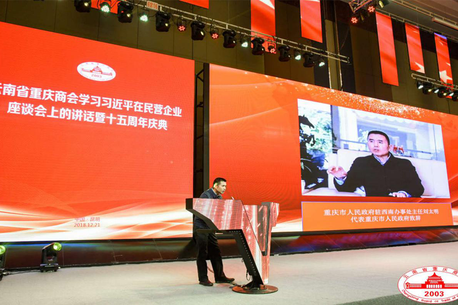 重庆市人民政府驻西南办事处主任刘太明同志在大会上致辞,他充分肯定了云南省重庆商会十五年来取得的辉煌成绩,并希望商会以党委成立为契机,深刻领会习总书记在民营企业座谈会上的讲话精神,做到不愧于滇渝两地各级政府的支持,不负重庆家乡父老的厚望!