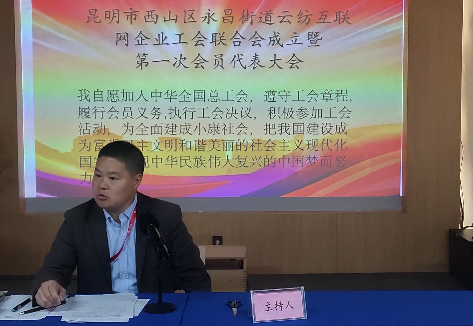 昆明市西山区永昌街道云纺互联网企业工会联合会成立暨第一次会员代表大会 发布时间:2021-11-12 浏览量:4358 2021年11月12日上午,在云纺博物馆学术报告厅,举行了“昆明市西山区永昌街道云纺互联网企业工会联合会成立暨第一次会员代表大会”,会上选举产生了工会联合会第一届委员会,由云南k8凯发科技股份有限公司文明同志担任主席、云南猎狐网络科技有限公司王良惠同志担任副主席、云南k8凯发科技股份有限公司杨利银同志担任女工委员。新任工会主席文明同志带领大家宣誓并讲话。