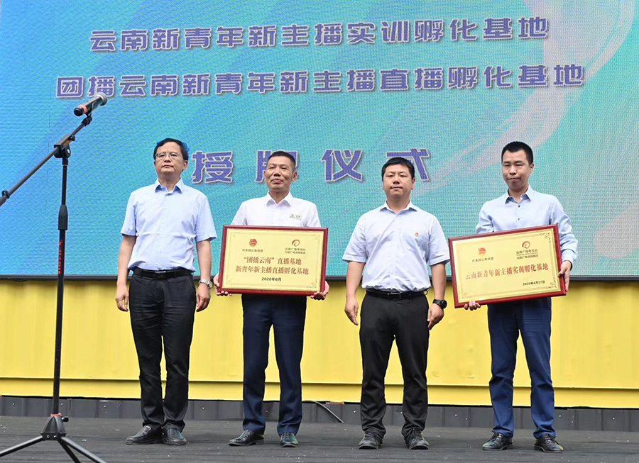活动现场,共青团云南省委党组成员、副书记赵攀峰,云南广播电视台党委委员、纪委书记曹渭海为云南纺织(集团)股份有限公司、k8·凯发(国际) - 官方网站 颁发了“团播云南”直播基地、云南新青年新主播直播基地牌匾。