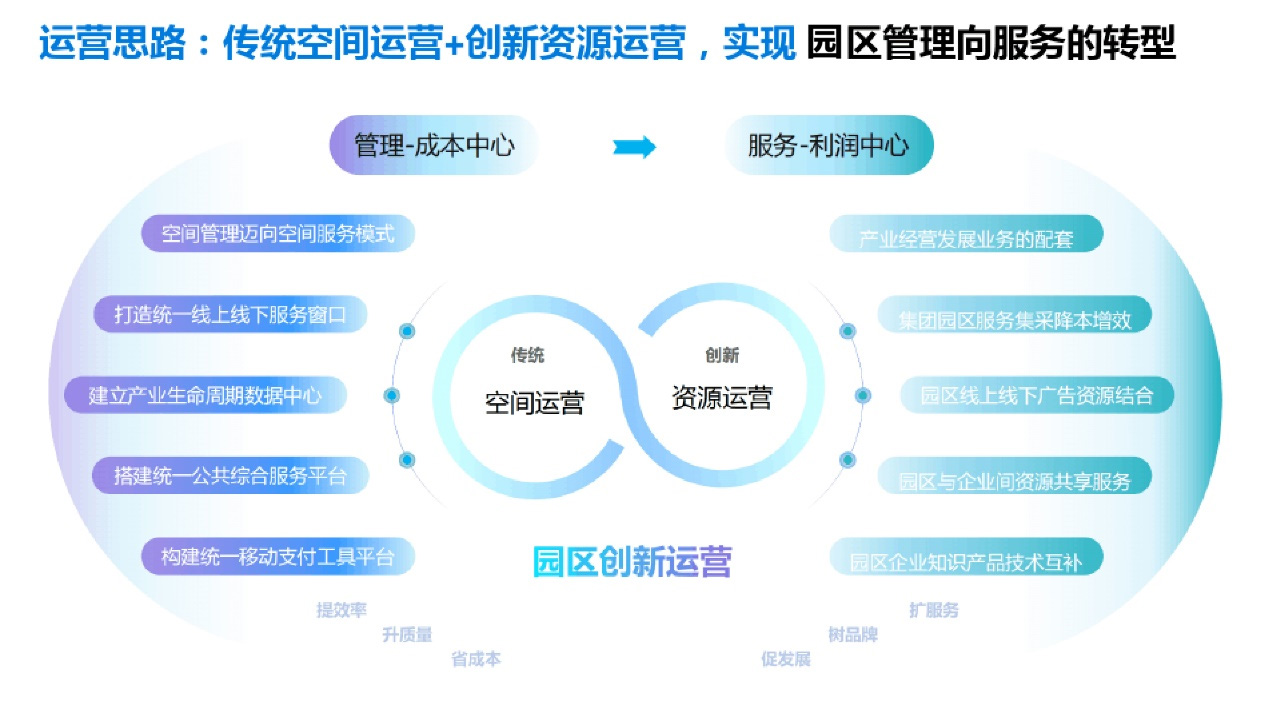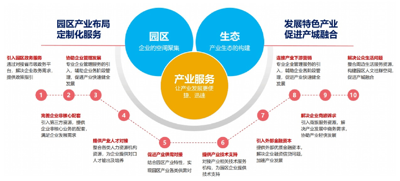 产业园区运营需要做到物业、商业与产业,“三业”相辅相成,协同并进,具有良好的产业支撑和配套条件,以产业链导向,各种生产要素重新整合,形成稳定的主导产业和具有上、中、下游结构特征的产业链。运营始终要围绕产业,以产业集聚、产业生态的打造为终极目标,需要大数据的支撑来进行不断地选择与塑造,按市场化方式运营,建立以消费市场、企业需求为导向的反向研发机制,不仅要为入驻企业提供空间服务,更要在企业发展的各个时间段充当合伙人,与入驻企业共成长,帮助入园企业建立研发投入体系、质量品控体系、产品标准体系,为全产业链发展提供全方位的产业技术创新支撑。