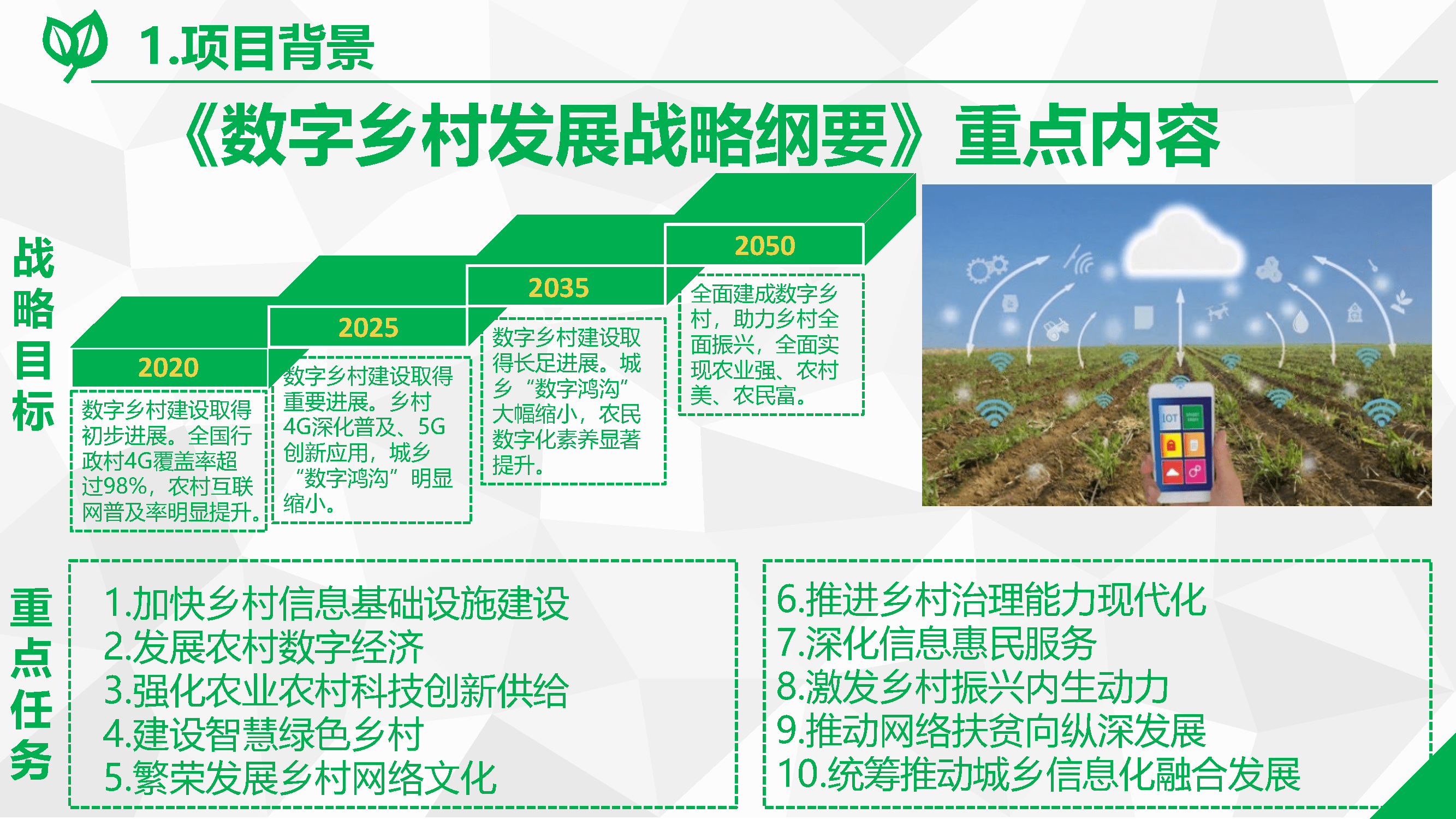 中央网信办等七部门联合印发《关于开展国家数字乡村试点工作的通知》提出完善“三农”信息服务体系,“三农”问题目的是要解决农民增收、农业发展、农村稳定,三农”问题关系到国民素质、经济发展,也关系到社会稳定、国家富强、民族复兴。聚焦农民生产生活实际需求,将“三农”信息服务体系建设落到实处,为村民提供精细化的村务管理,人性化的惠民服务,专业化的农事生产,生态化的村容村貌,新时代的乡风文明。