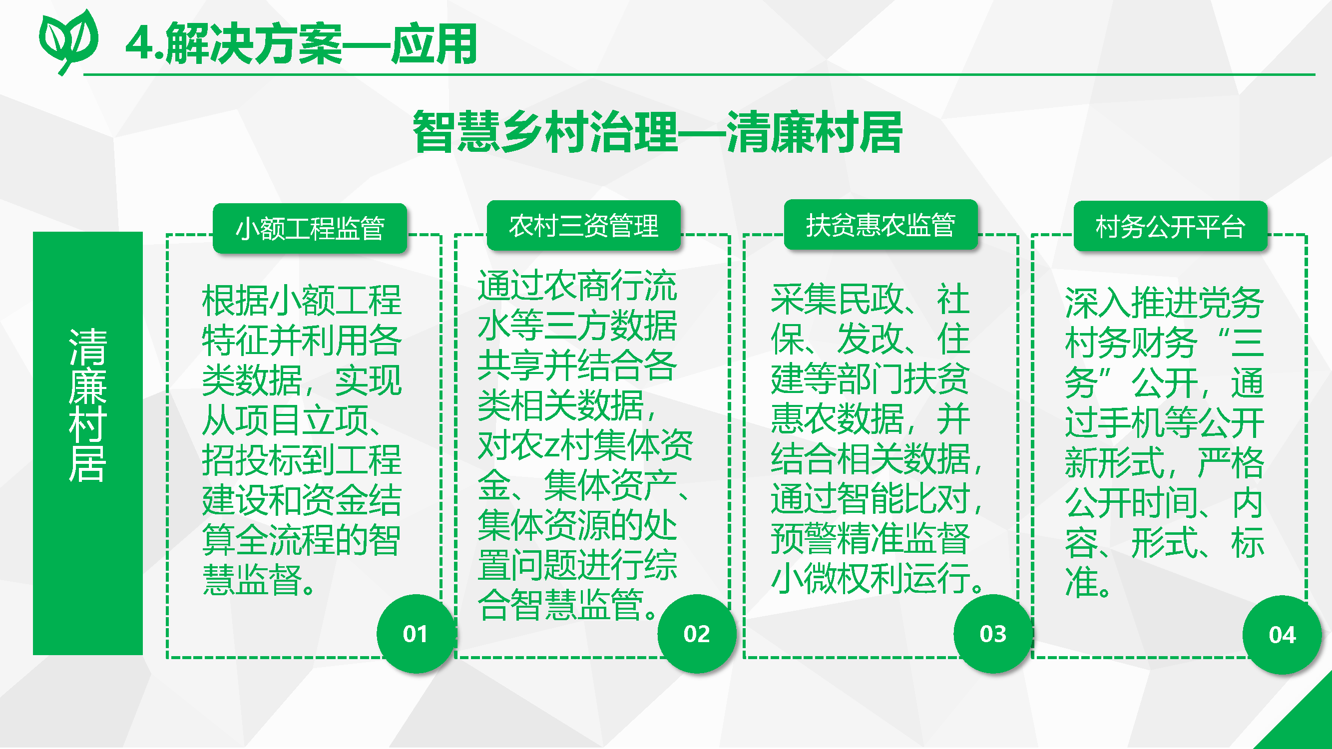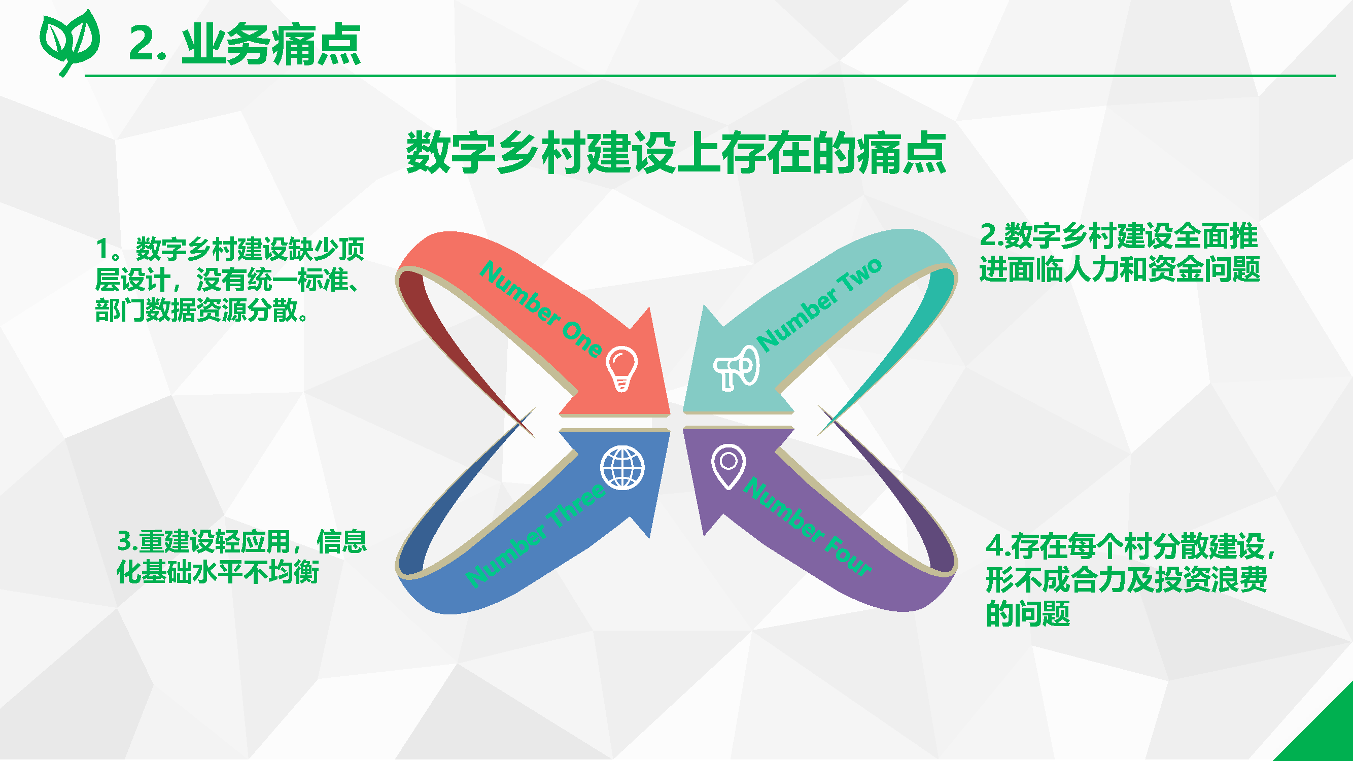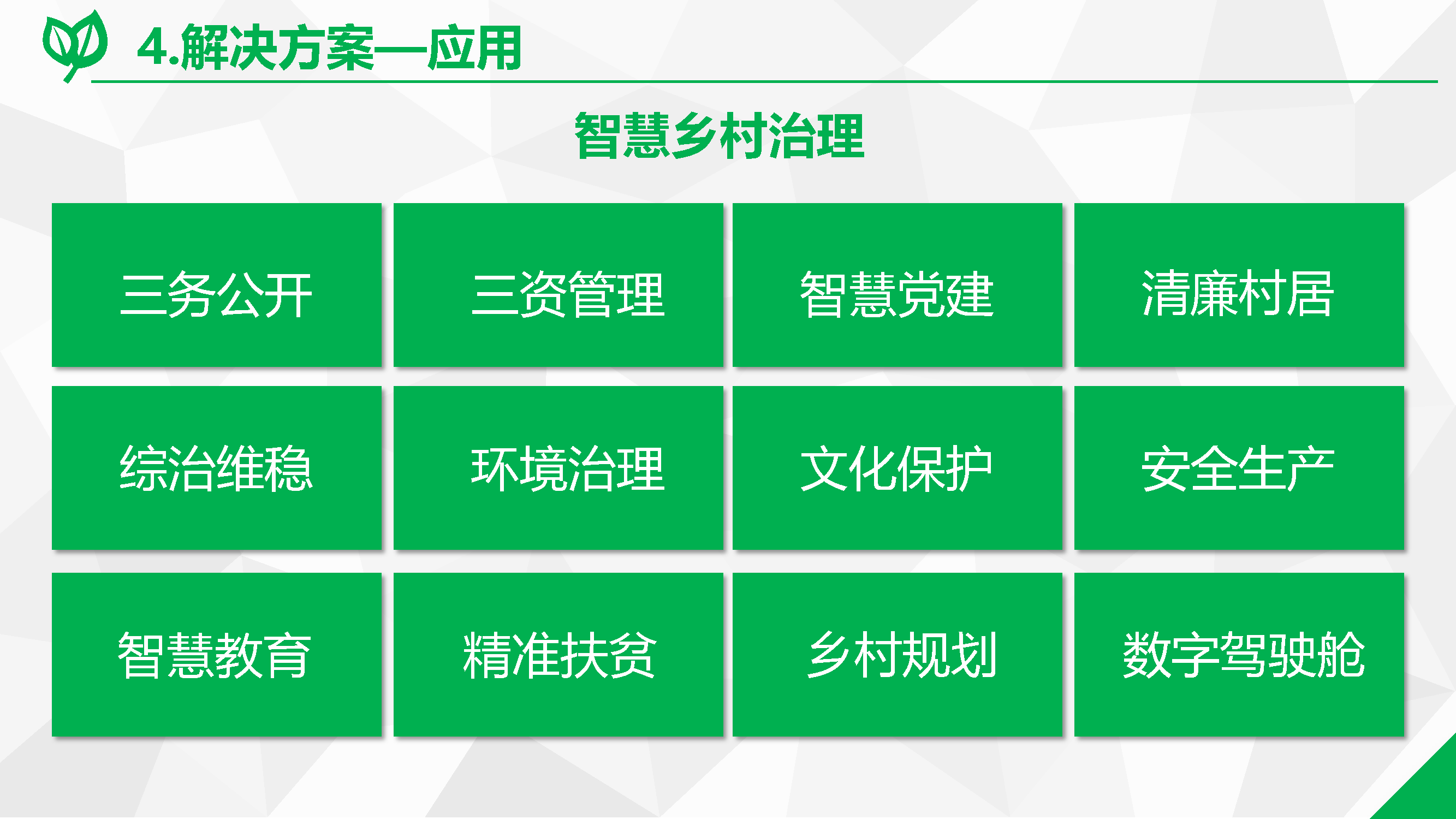 根据乡村振兴战略的总体部署,乡村治理工作应着重提升智能化、精细化与专业化水平。因此,结合自身的数字化应用开发能力,聚焦智慧党建、村镇环境保护,以及城镇综合行政执法工作的数字化,为县域建立健全数字治理新模式提供支撑。