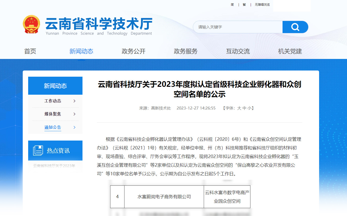 根据《云南省科技企业孵化器认定管理办法》(云科规〔2020〕6号)和《云南省众创空间认定管理办法》(云科规〔2021〕1号)有关规定,经单位申报、州(市)科技局推荐和省科技厅组织的材料初审、现场查验、综合评审、厅务会审议等工作程序,k8凯发集团旗下水富蔚岚电子商务有限公司获“省级众创空间”认定。目前公司已获得昭通市科技局“昭通市数字电商科技企业孵化器”、省工信厅“2022年度中小企业公共服务示范平台”等多项认定和荣誉。