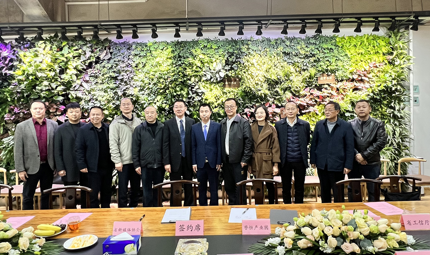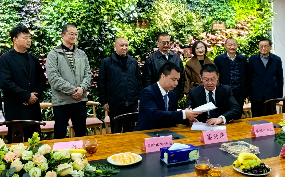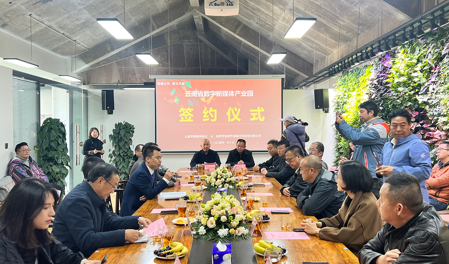 2024年1月10日下午,云南省新媒体协会会长郑桂文与昆明誉恒软件基地开发建设有限公司董事长周晓东在昆明经开区签订《合作协议》,双方将共同建设运营“云南省数字新媒体产业园”,合力打造7.6万平方米规模的数字新媒体产业集聚区、生态区、服务区。