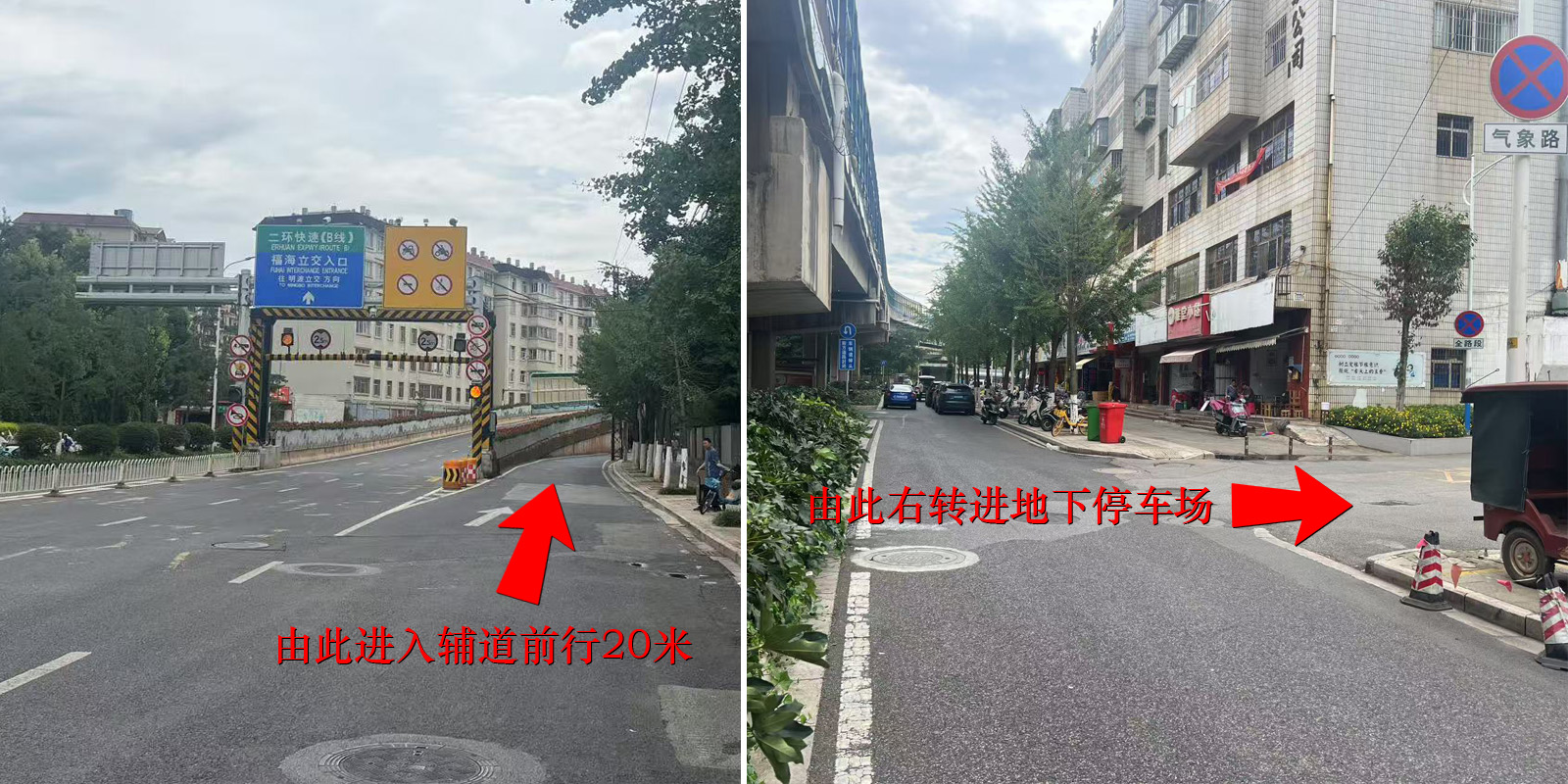 开车路线导航:请沿着气象路上二环方向,按左上图所示走辅道(不要上高架)前行20米,按右上图所示右转下地下停车场,进入停车场急左转直行下负三楼,在A1地块4栋(A座写字楼)电梯口(k8凯发集团专用停车位)停车,然后坐电梯至8楼。