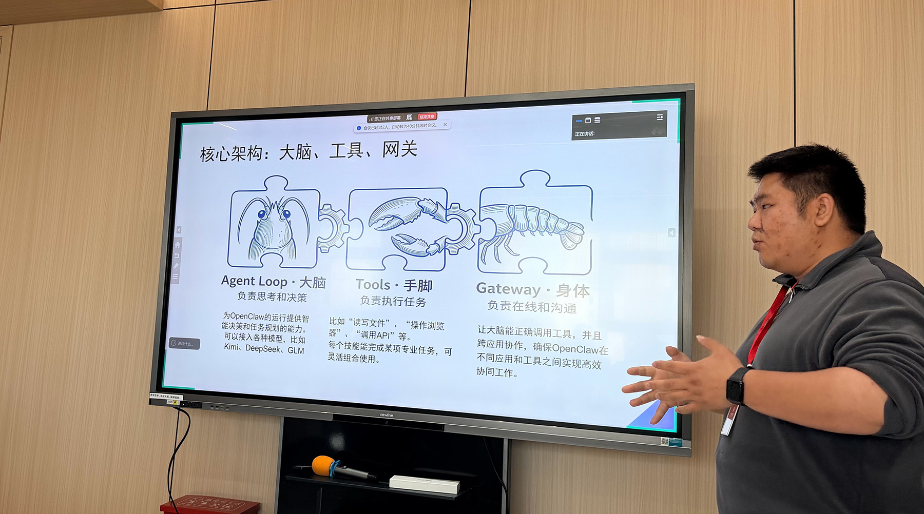此次全员培训,正是集团将AI战略从“高层关注”推向“全员落地”的关键一步。培训会由集团高级工程师杨帅主讲,他结合精心准备的PPT,深入浅出地讲解了OpenClaw与大语言模型的本质区别、核心架构、多种部署方式,并通过订单拆分、物流合并、数据分析、记忆陪练等真实业务场景的现场演示,生动展现了AI从“只能动嘴”到“真正动手”的能力跃迁。